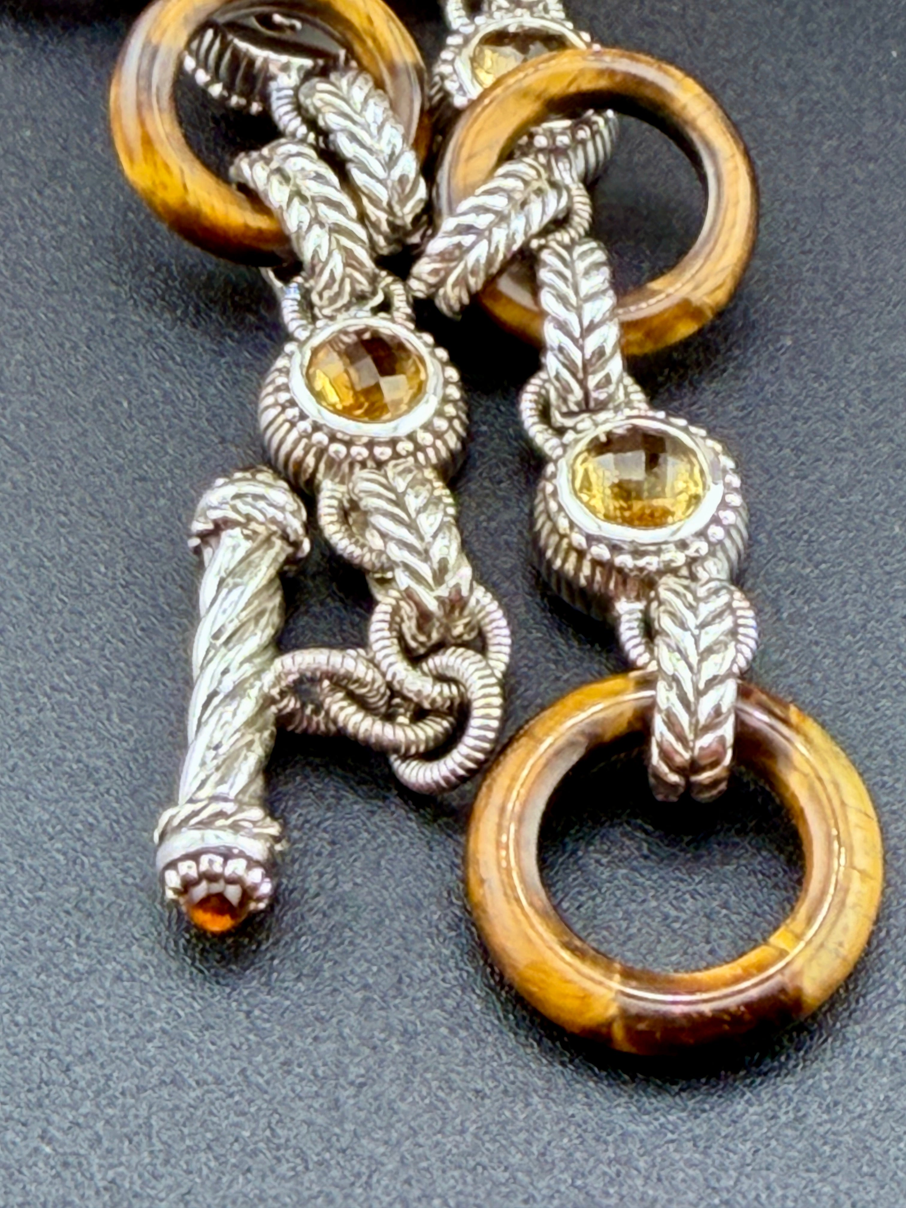 - Design details: interconnected twisted rope links, circular Tiger's Eye elements, and bezel-set Citrine highlights