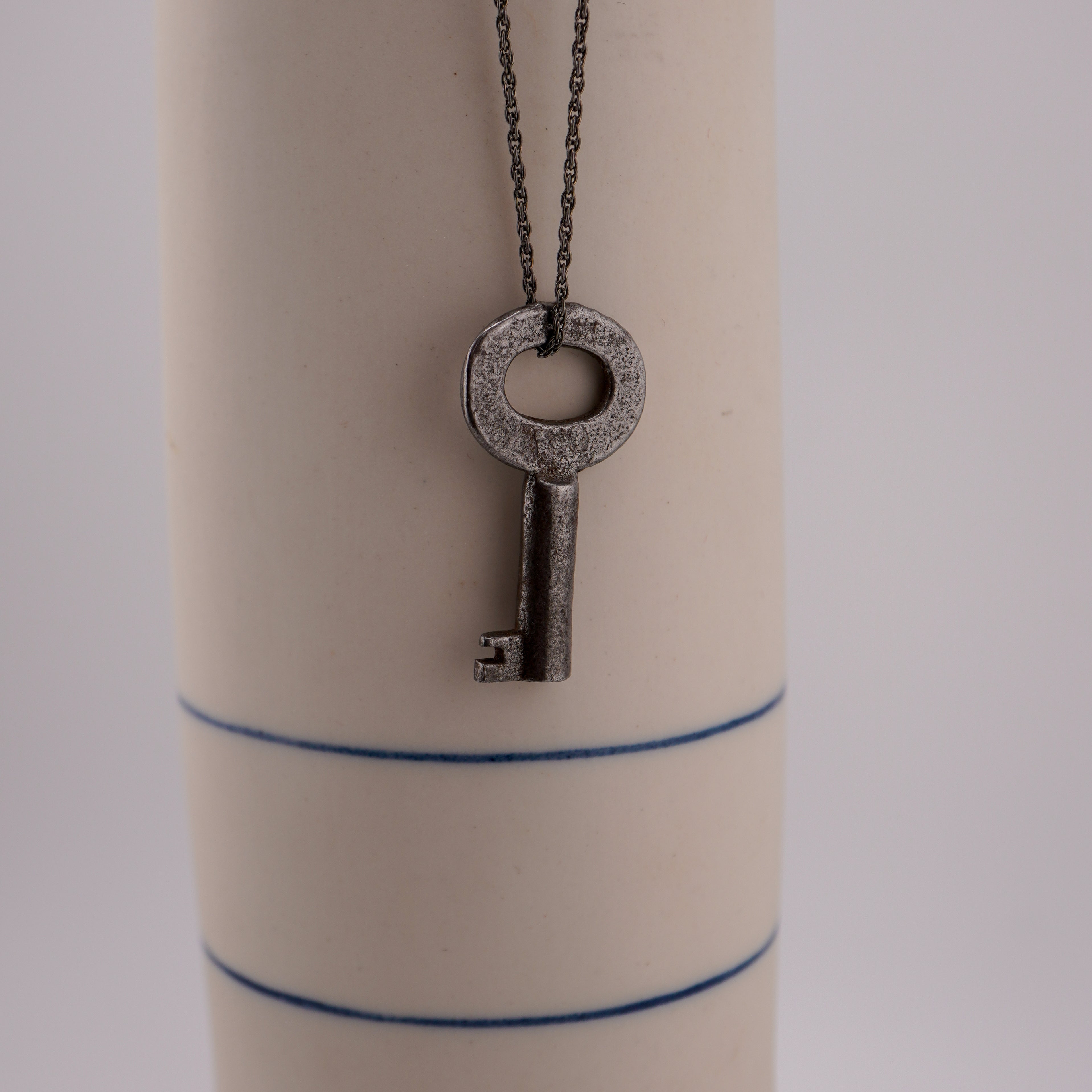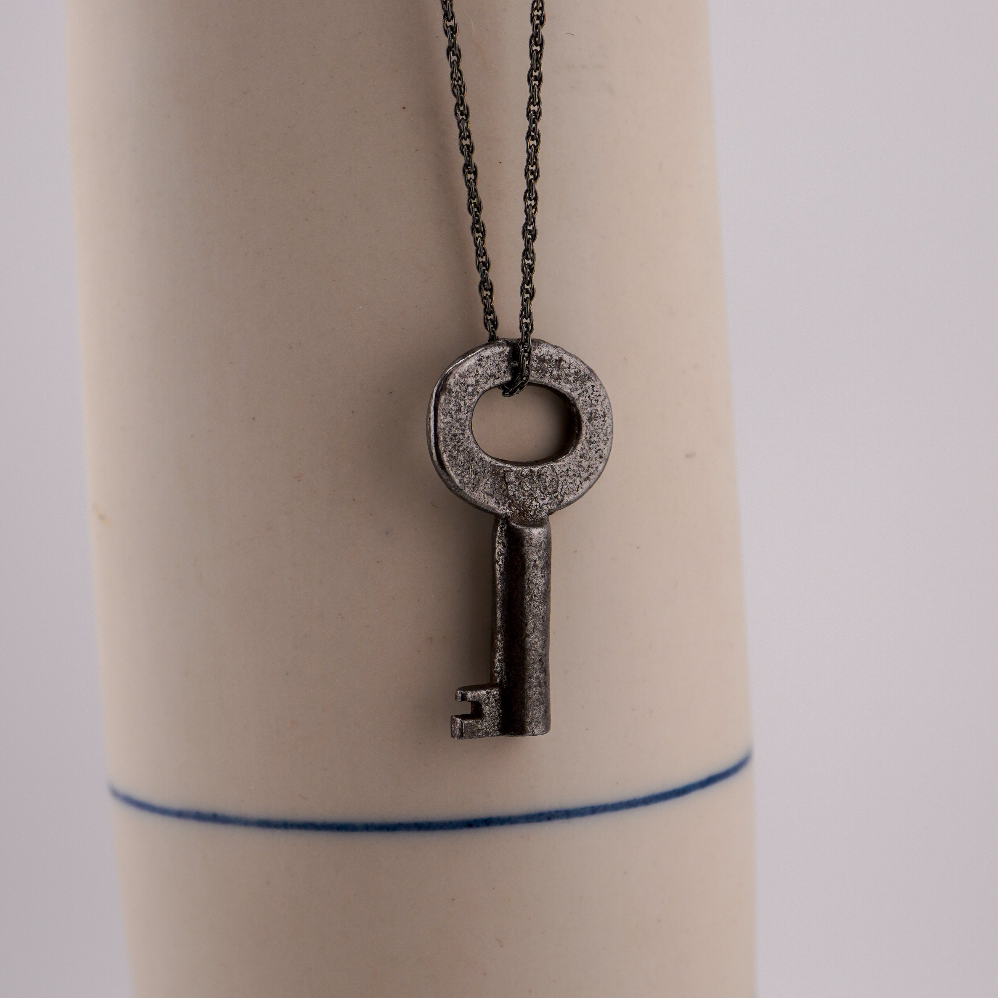 Care Tips: Store separately to avoid scratches. Avoid harsh cleaners to preserve patina on key; polish chain lightly with a silver cloth as needed.