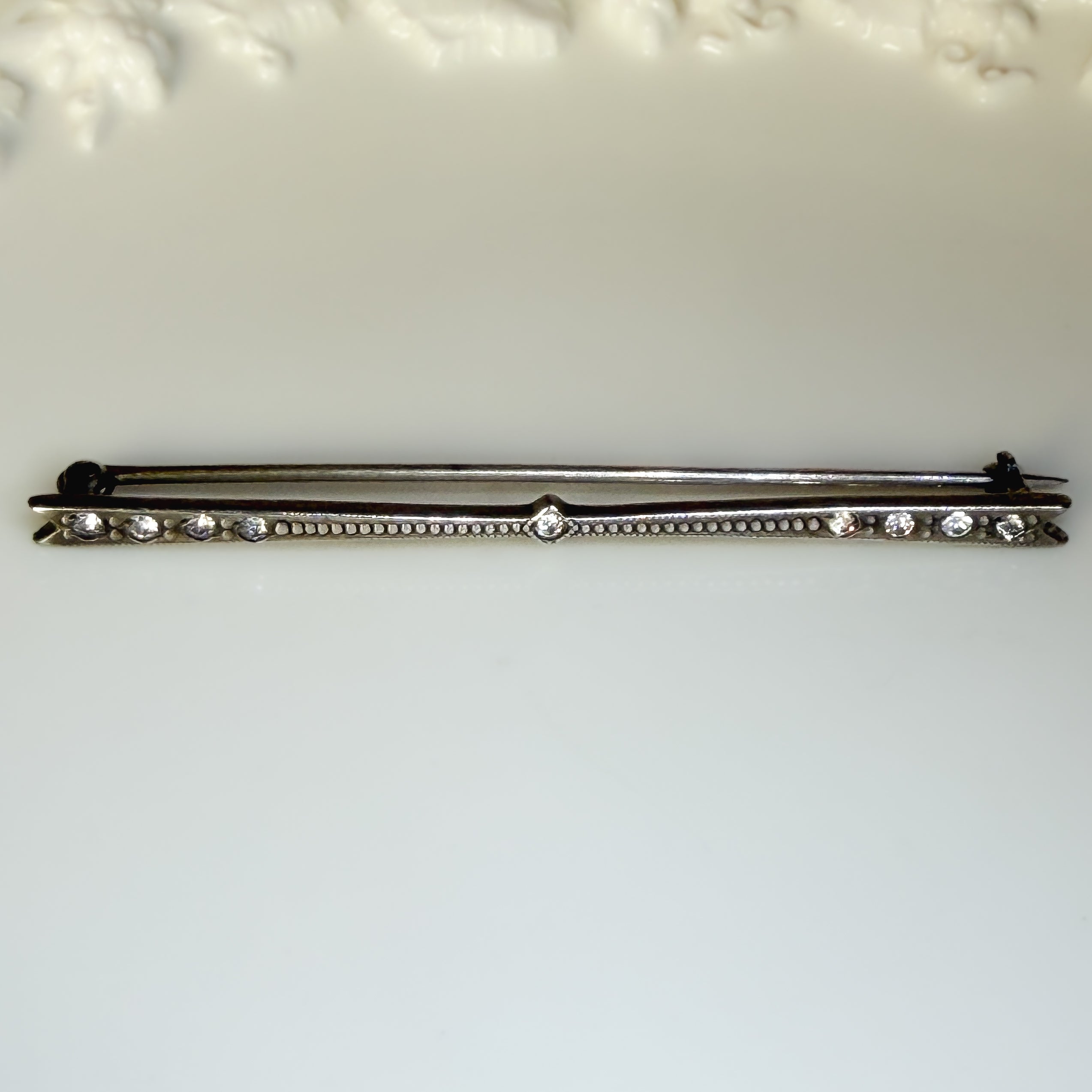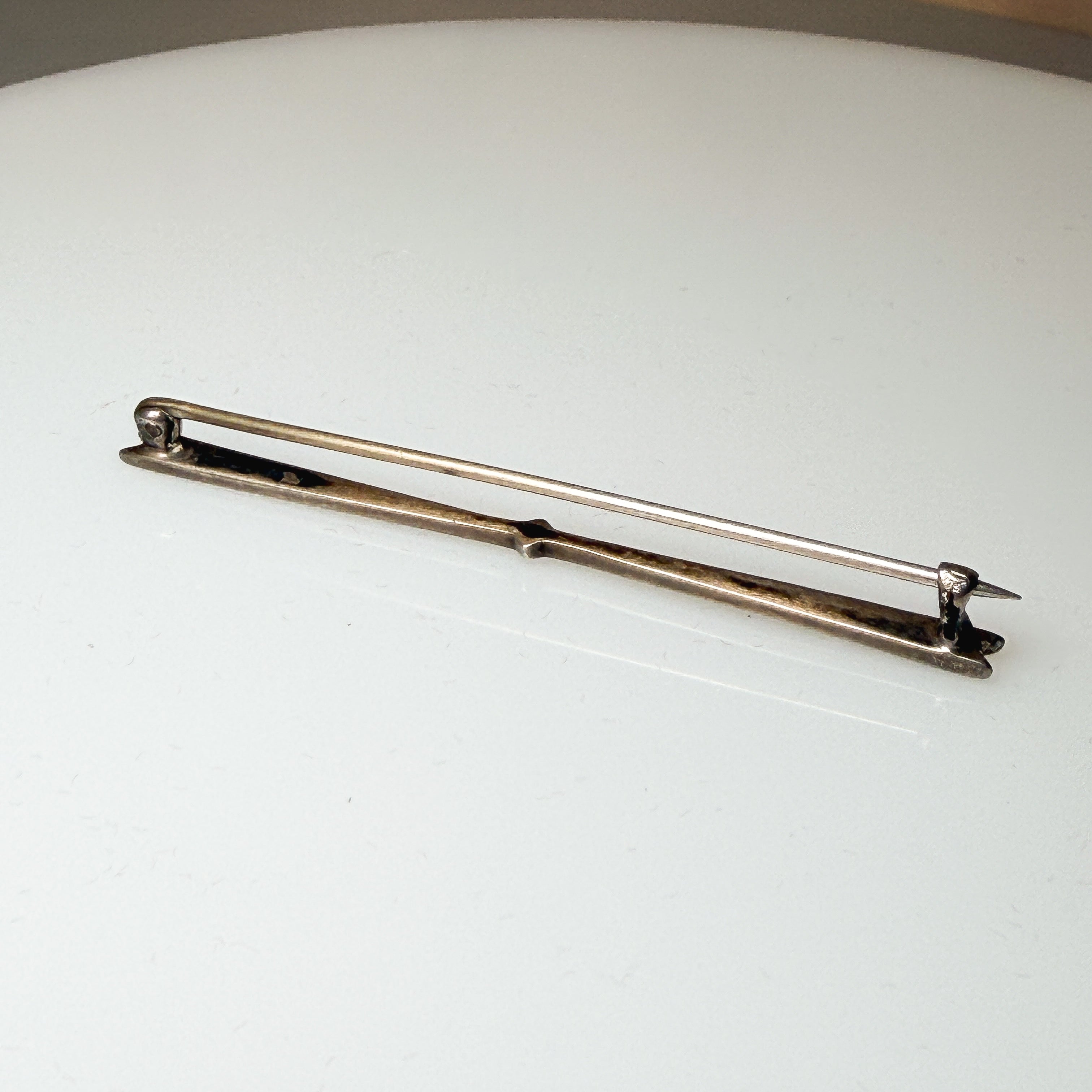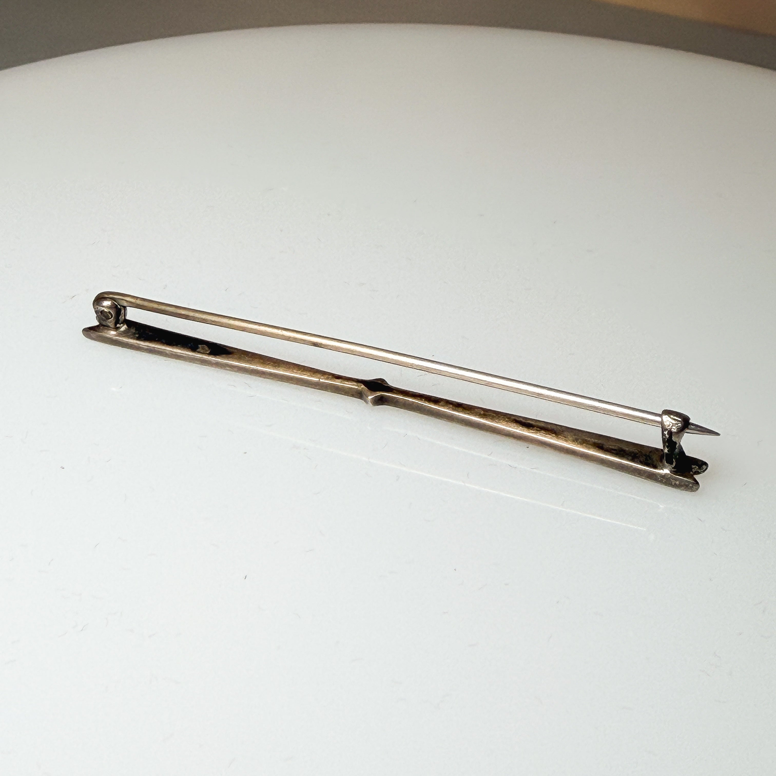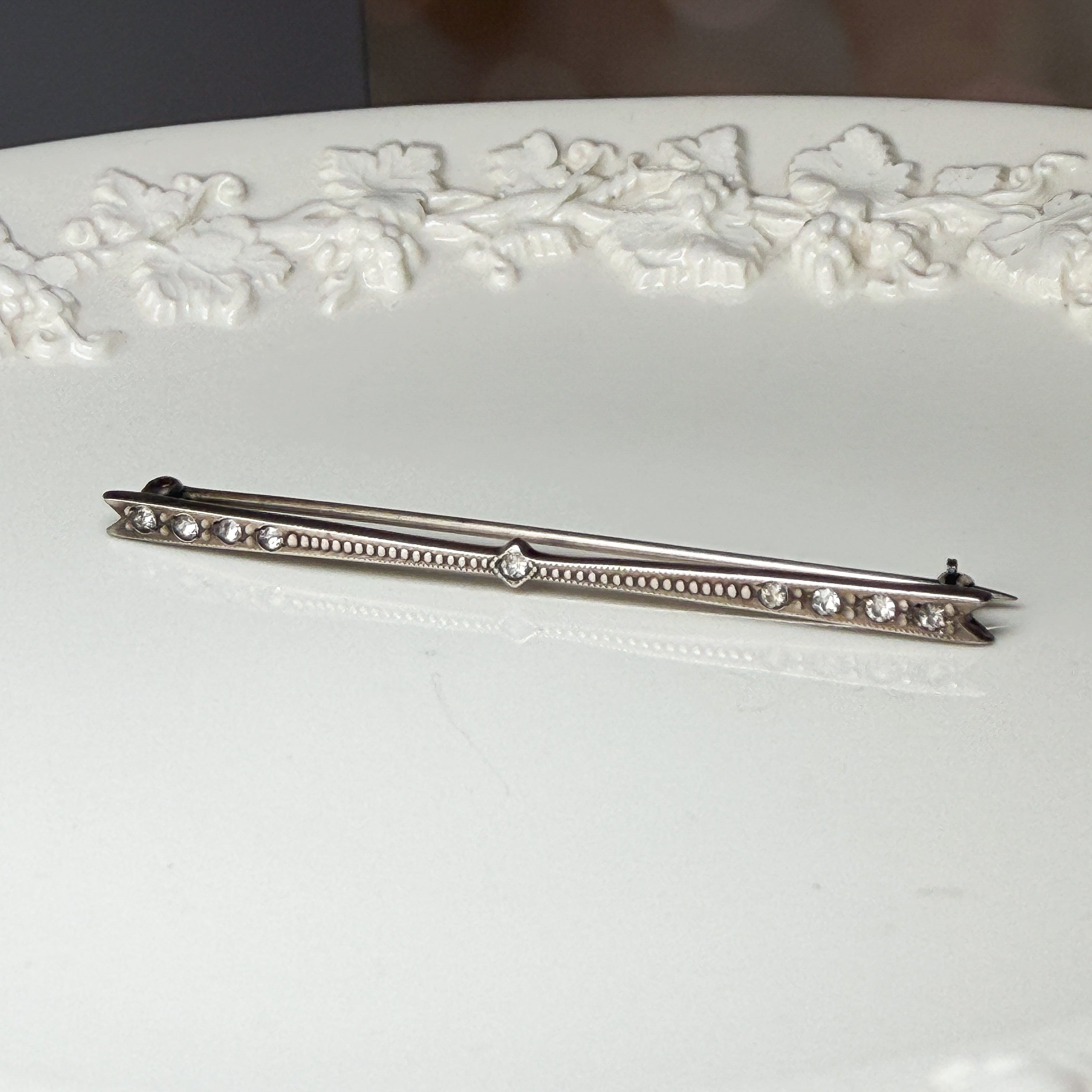 A sleek, elegant Art Deco bar brooch crafted in sterling silver, featuring bright paste stones and milgrain detailing. This timeless accessory adds vintage glamour to any outfit and is a refined addition to our Brooches & Lapel Pins collection.