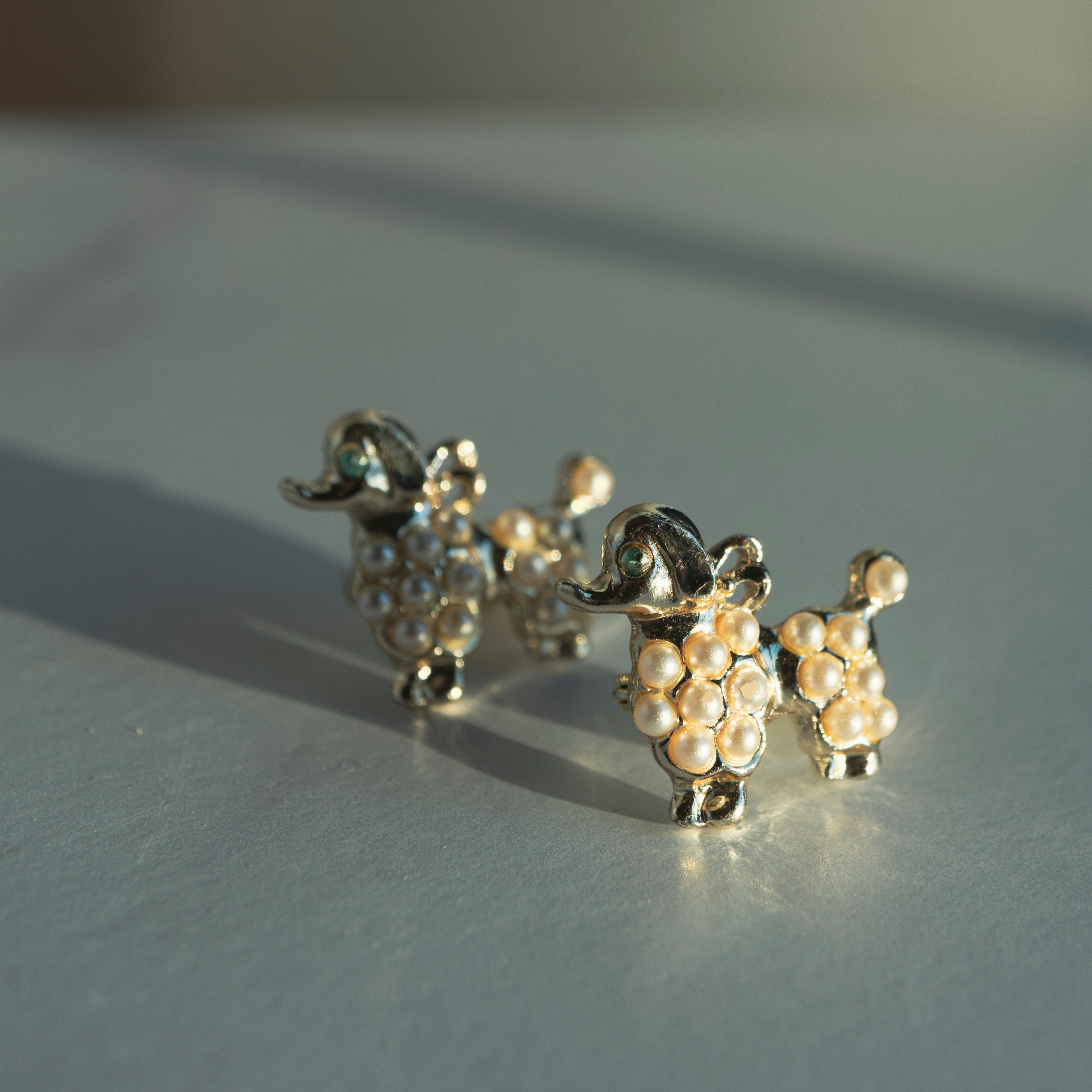 Vintage Brooch Pair: Tiny Gold Tone French Poodle Design with Faux Pearls