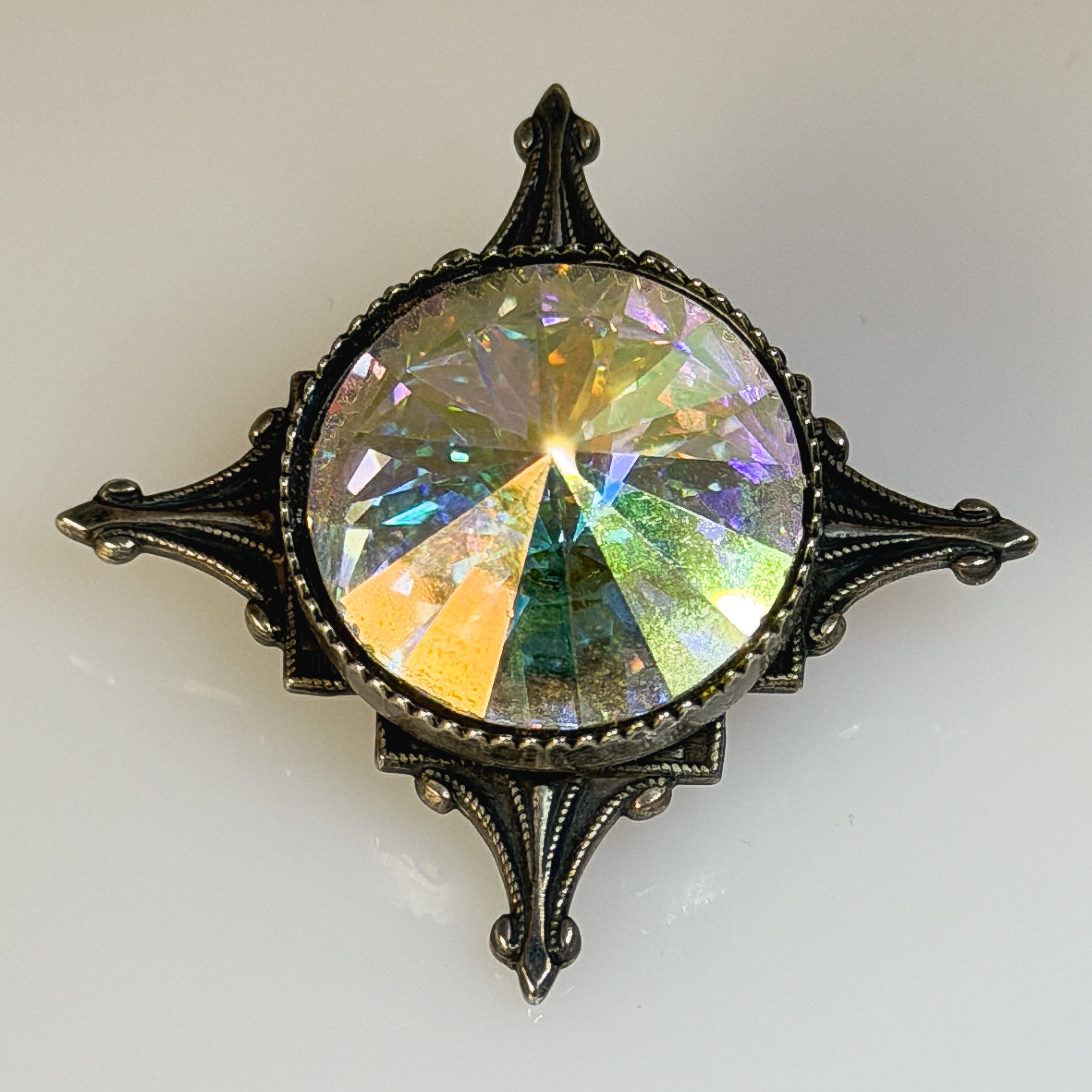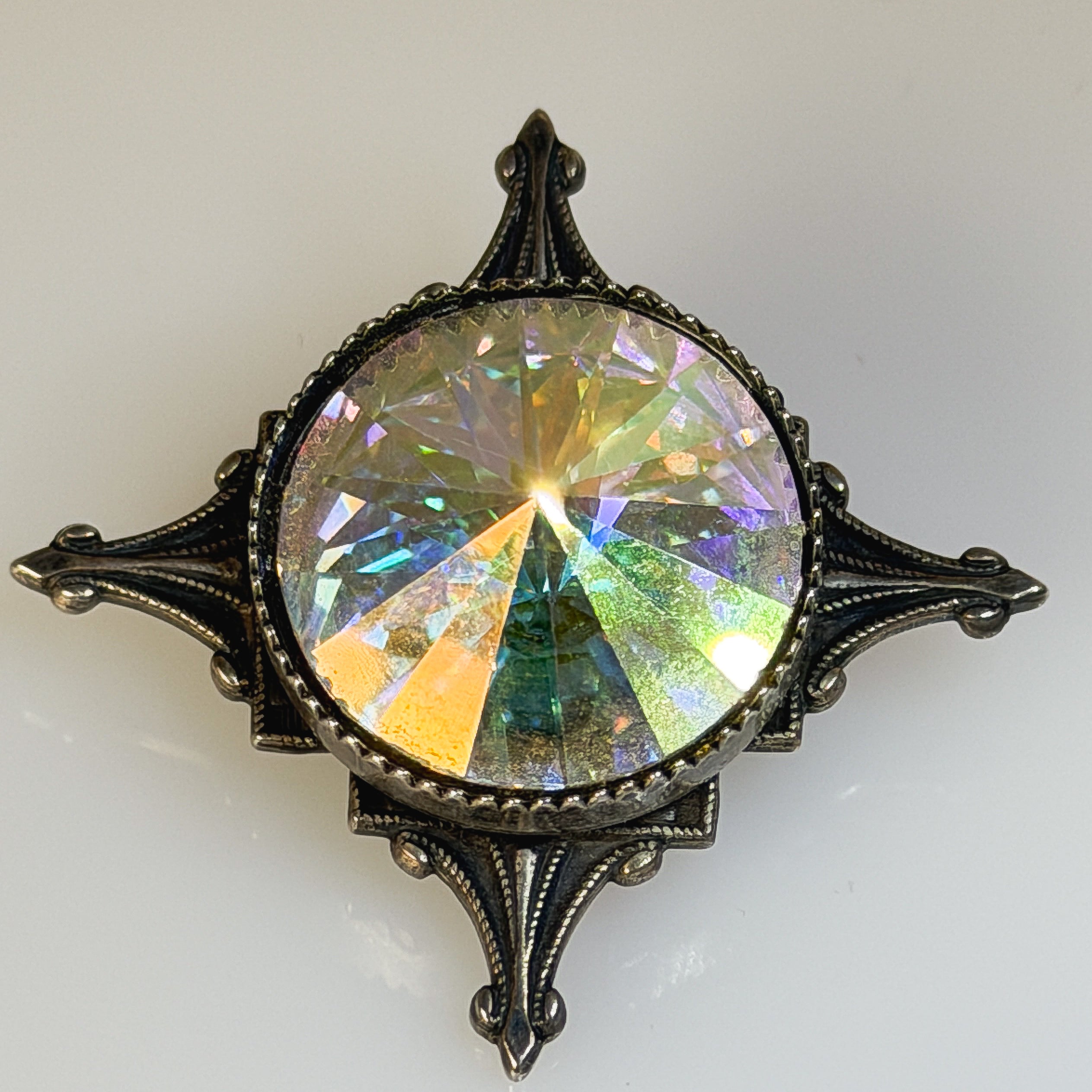 Introduce a touch of vintage glamour to any outfit with the Sterling Radiant-Cut Aurora Borealis Brooch. This 1.5" diameter statement piece is crafted in sterling metal and centers on a large, faceted prism stone that flashes a rainbow of colors with every angle of light.