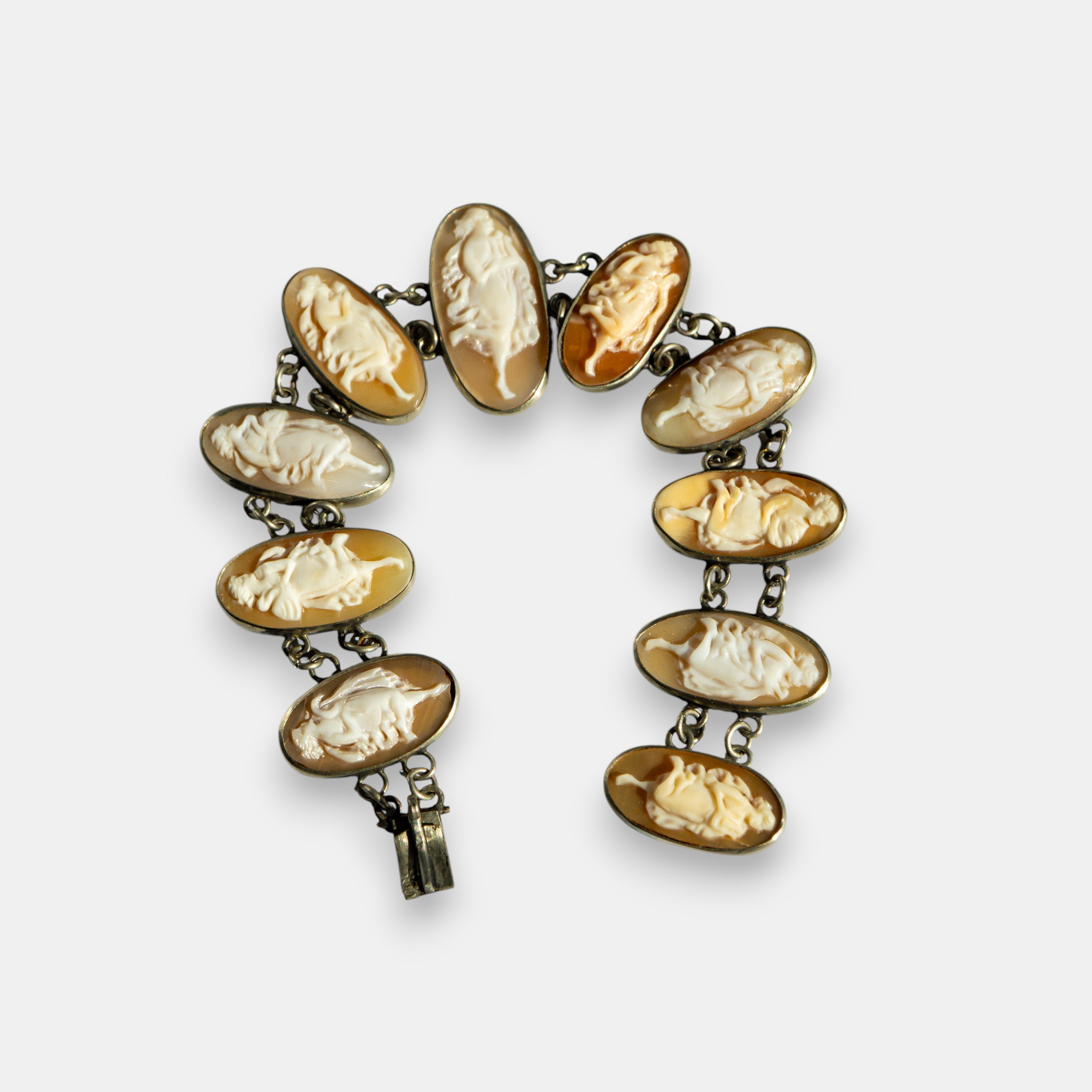This exquisite panel bracelet is a beautiful echo from the Victorian era (c. 1837–1901), a time when sentimentality, romance, and classical art were deeply woven into personal adornment. Cameos, with their hand-carved scenes depicting mythological figures and serene classical portraits, were immensely popular — brought back from the "Grand Tours" of Italy as treasured souvenirs and symbols of culture and refinement. Each of the ten shell cameos in this bracelet is a miniature work of art, showcasing the remarkable skill of the artisan who carved them over a century ago. To own a piece like this is to hold a tangible connection to the past — a wearable gallery of classical beauty that has been cherished through generations.