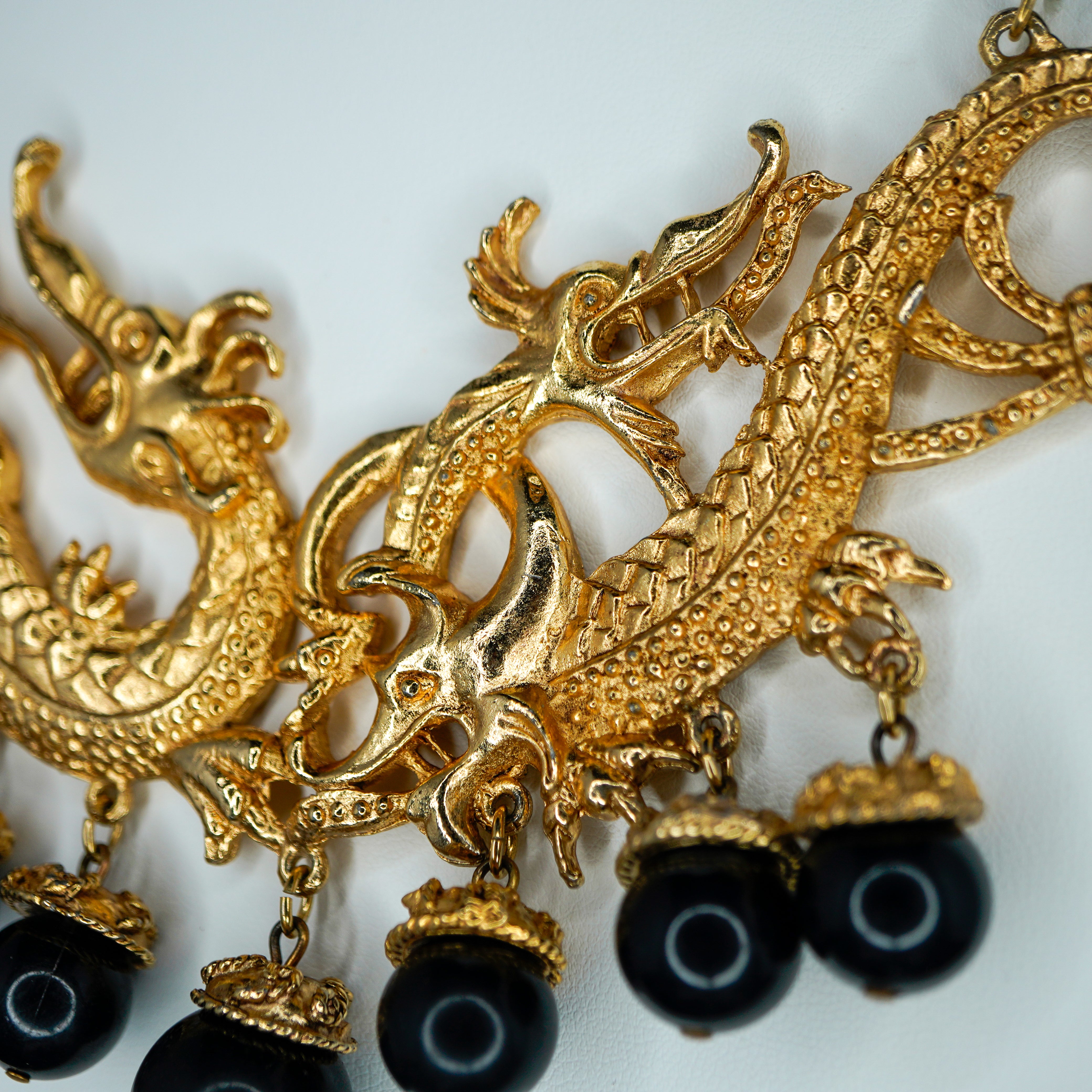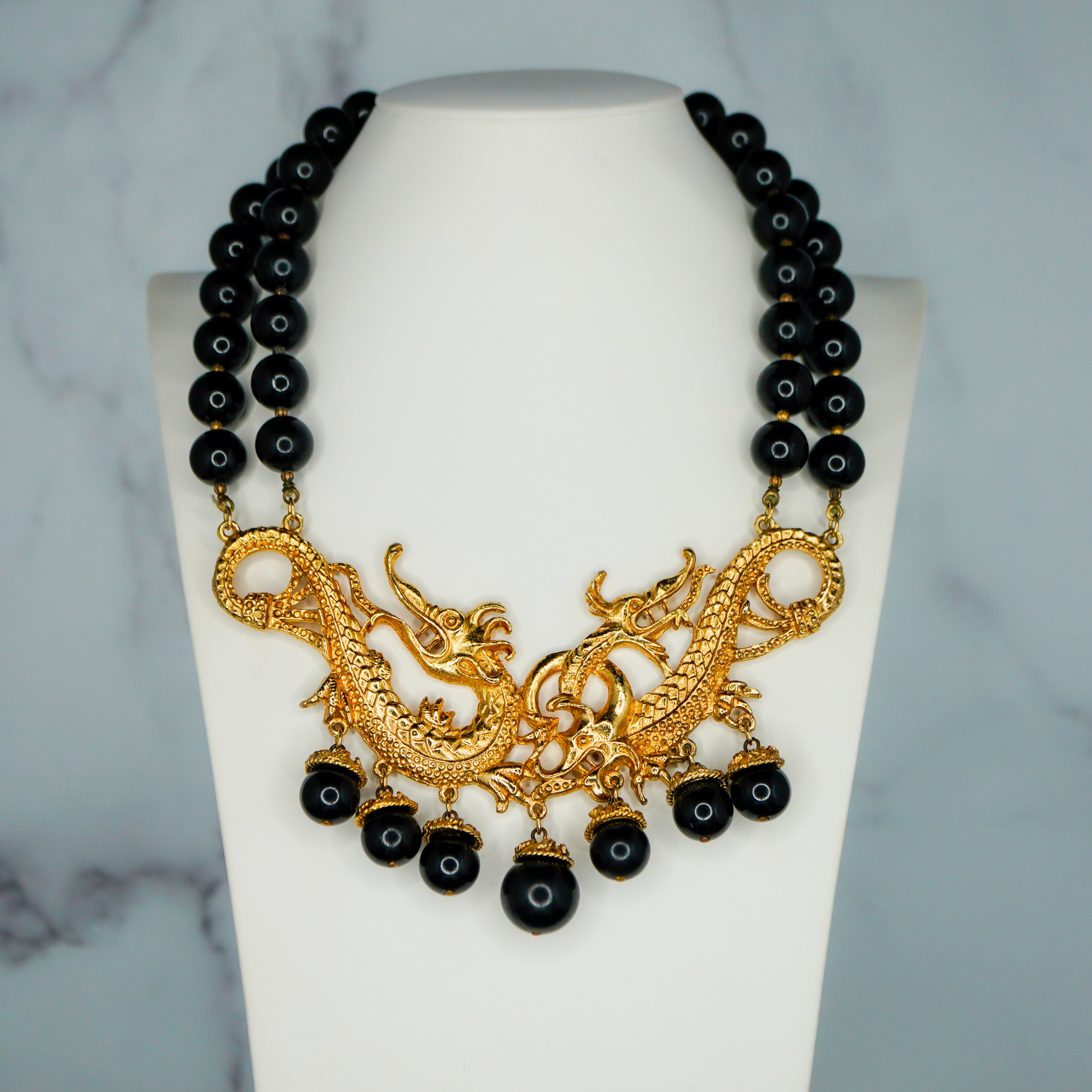 Large Ornate Goldtone Dragon Necklace with Black Beads