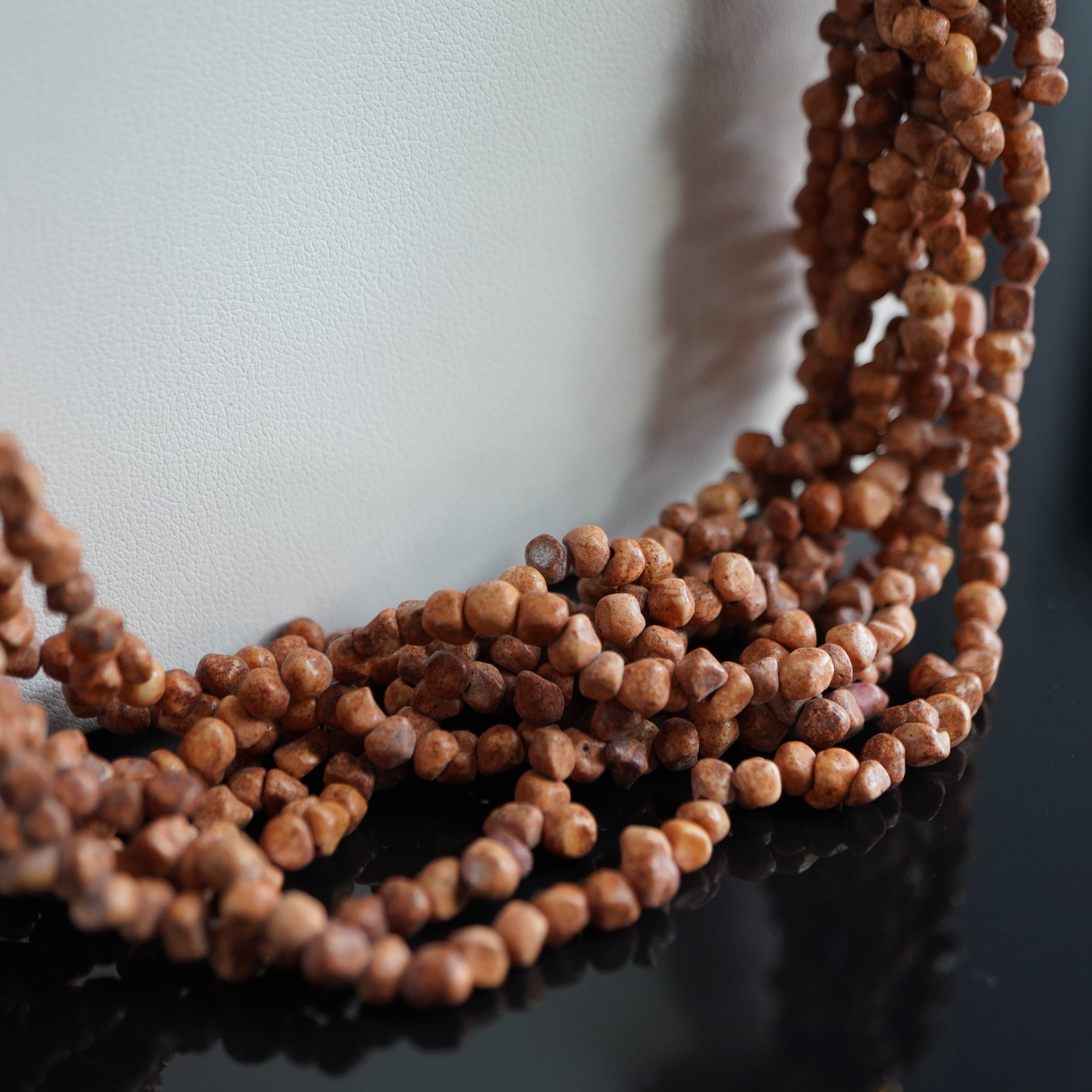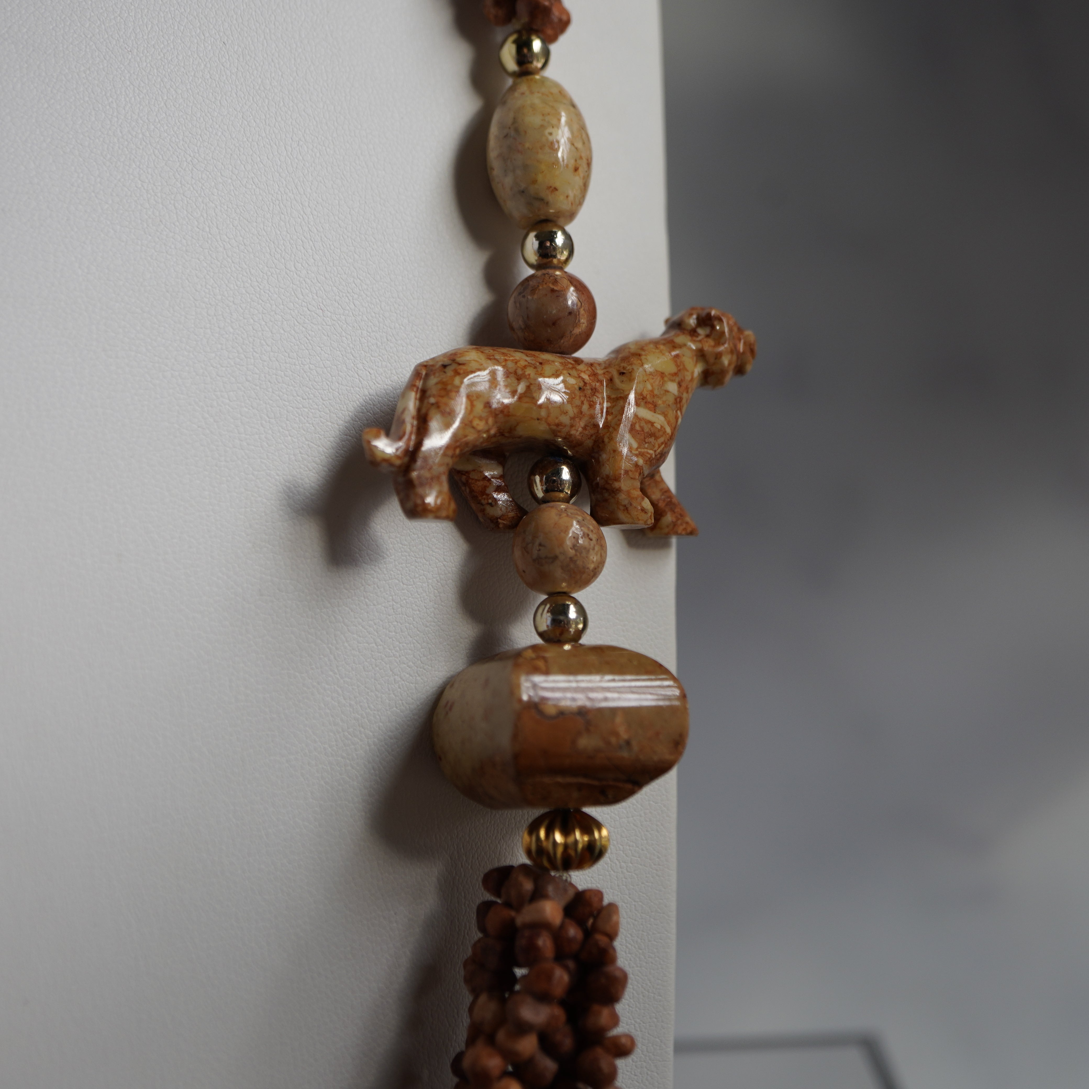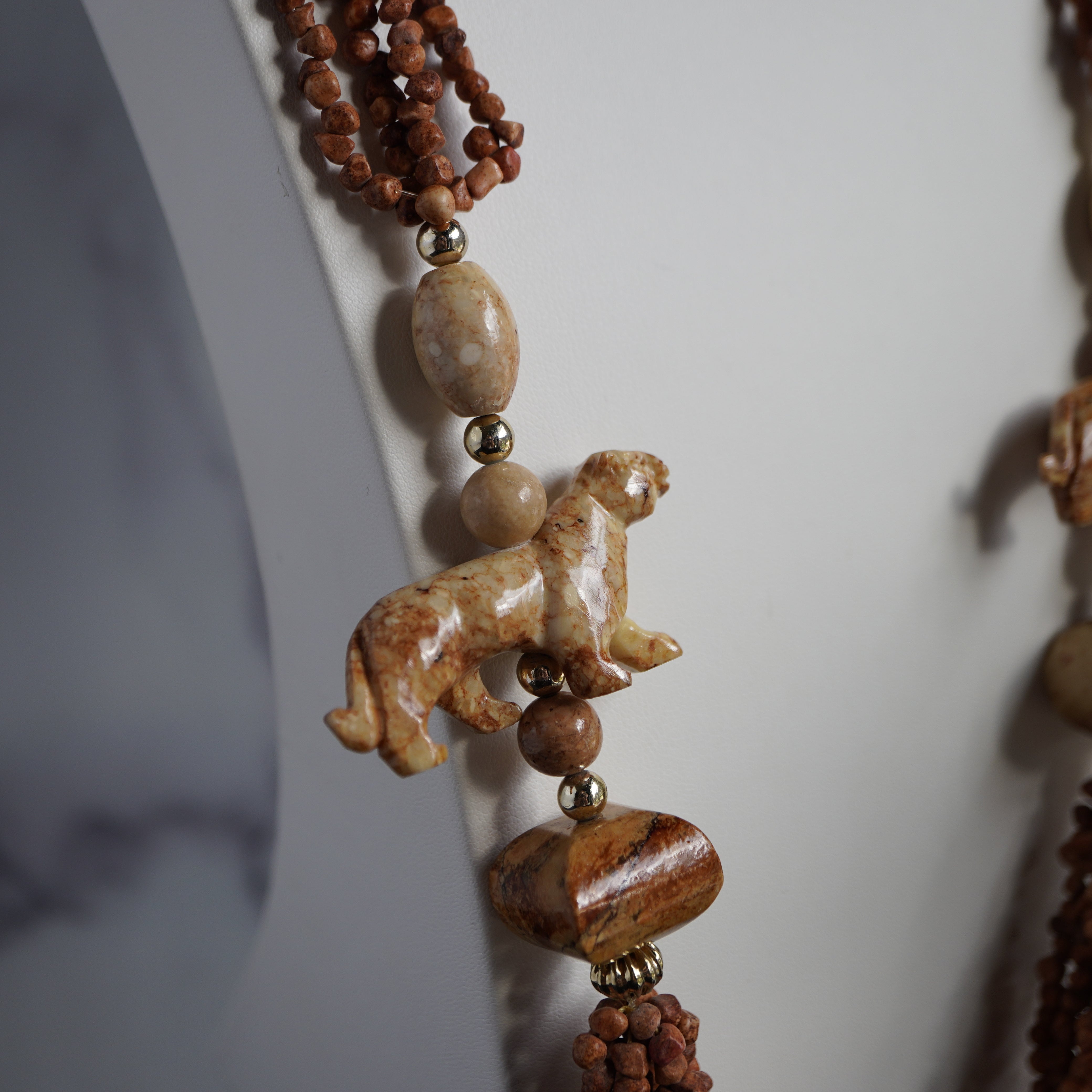 - Style: Multi-strand chip bead necklace with hand-carved animal pendants (Bohemian / Artisan / Fetish-style)