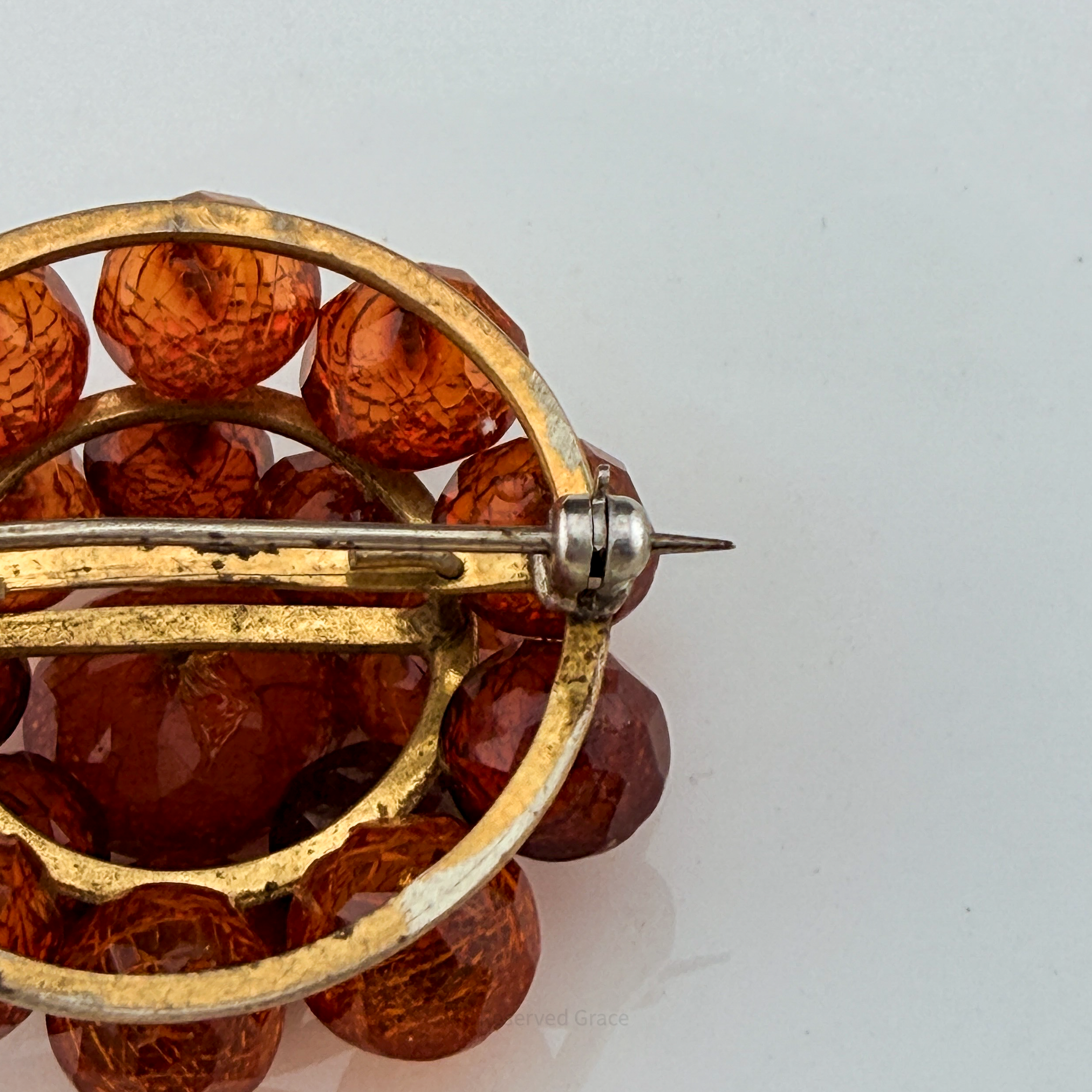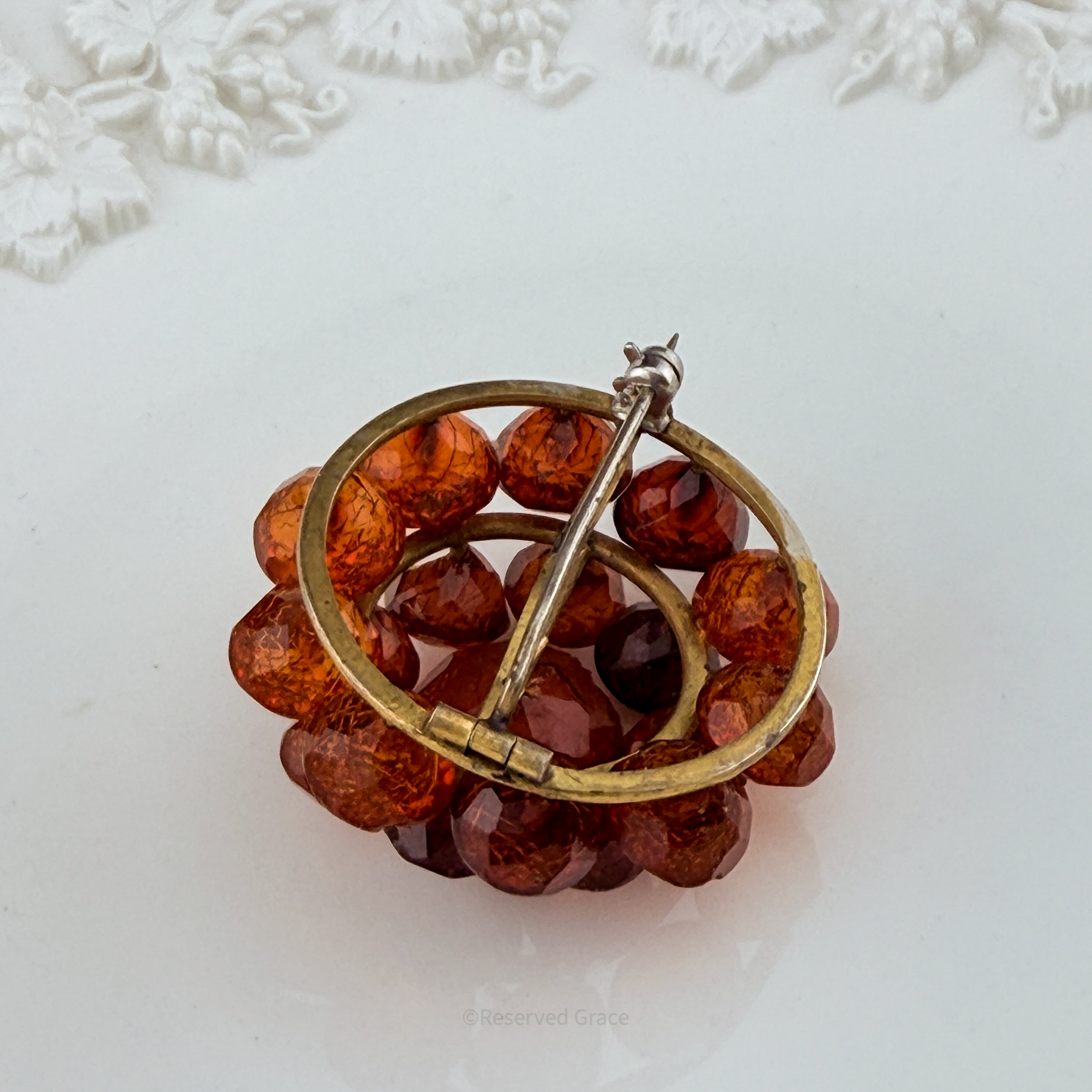 Collector's Grade: This brooch has been exceptionally preserved and presents beautifully. Please note: the large center bead has a small chip on one facet, consistent with its age and the nature of natural amber — this in no way diminishes its beauty or collector value, and is fully disclosed. This piece would have had a C-clasp holding the pin, which was replaced with a rollover clasp, and is functional and holds the pin securely.