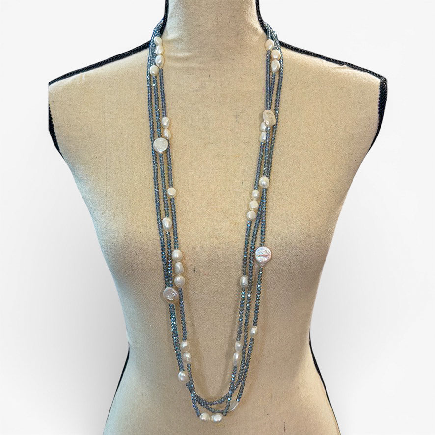 Grace Note: "There is a wonderful 'celestial' quality to this piece—the way the midnight-blue faceted crystals act as a dark sky for the iridescent coin pearls to shine against. Because it’s a generous 40-inch length, the styling possibilities are endless. I love looping it once for a staggered, layered effect that brings a sense of 'quiet drama' to a simple black shift dress or even a crisp white linen tunic."