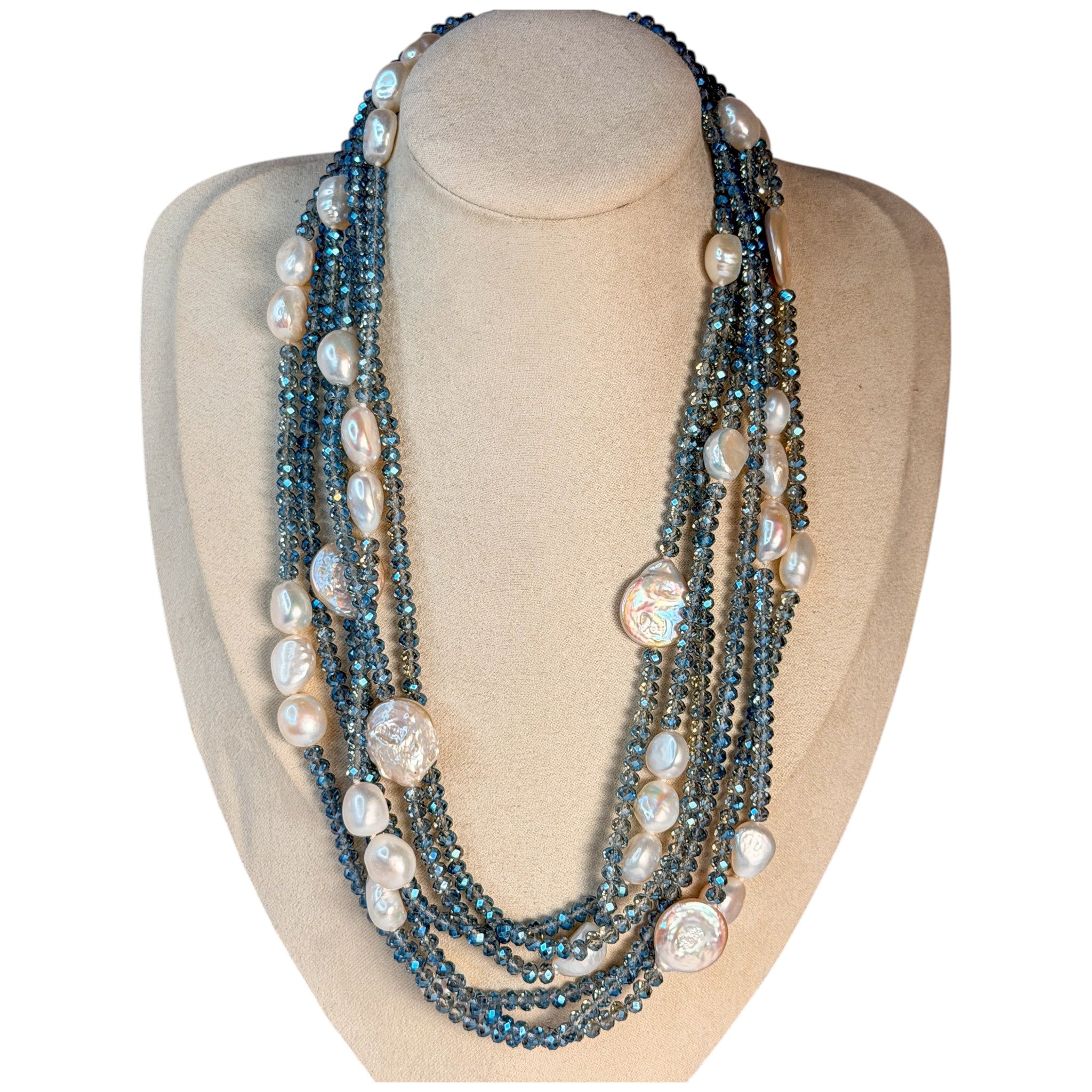 - Design: Triple-strand, staggered layers with deep-blue crystals and iridescent coin pearls with a undetstated silvertone clasp.