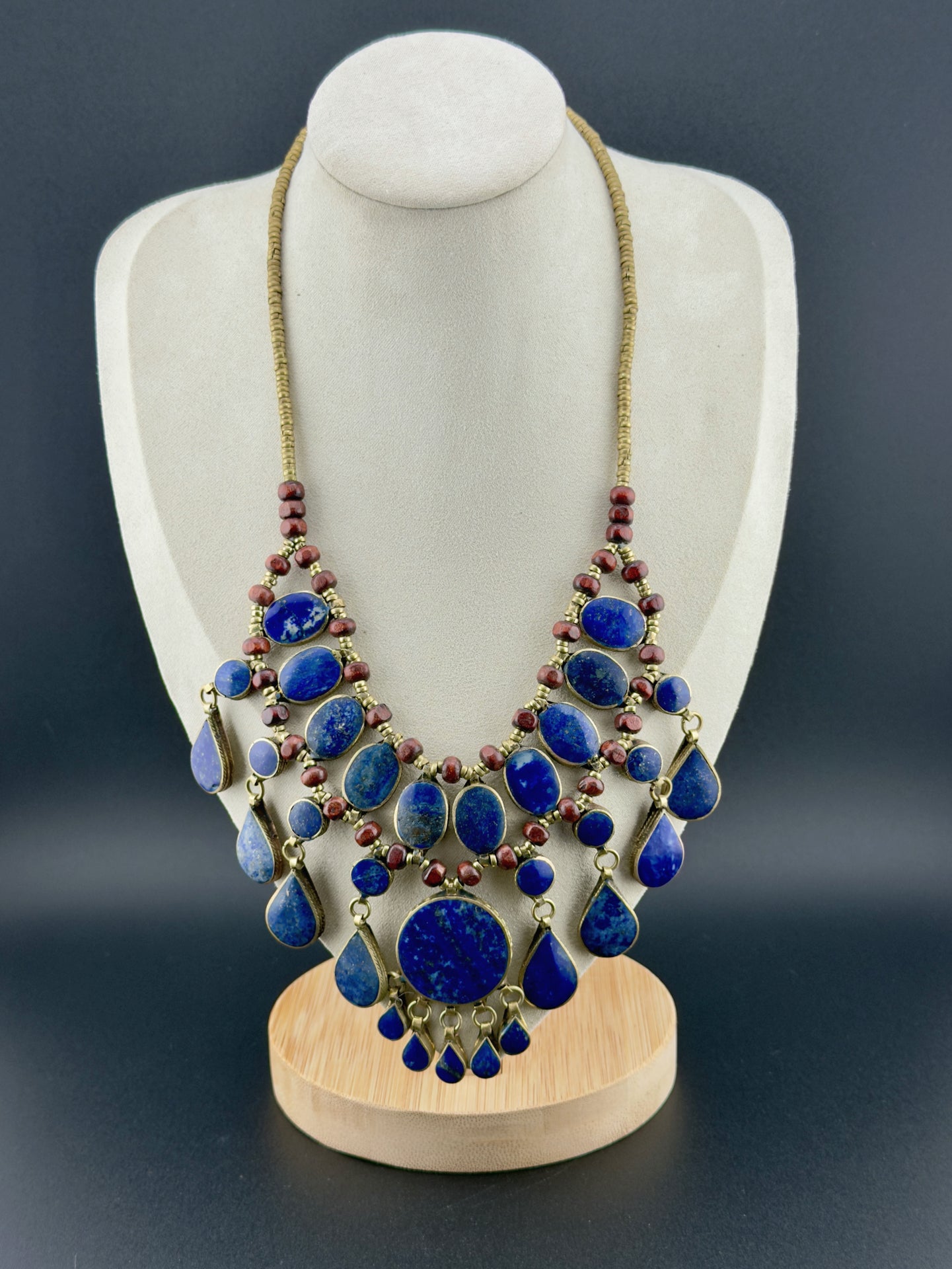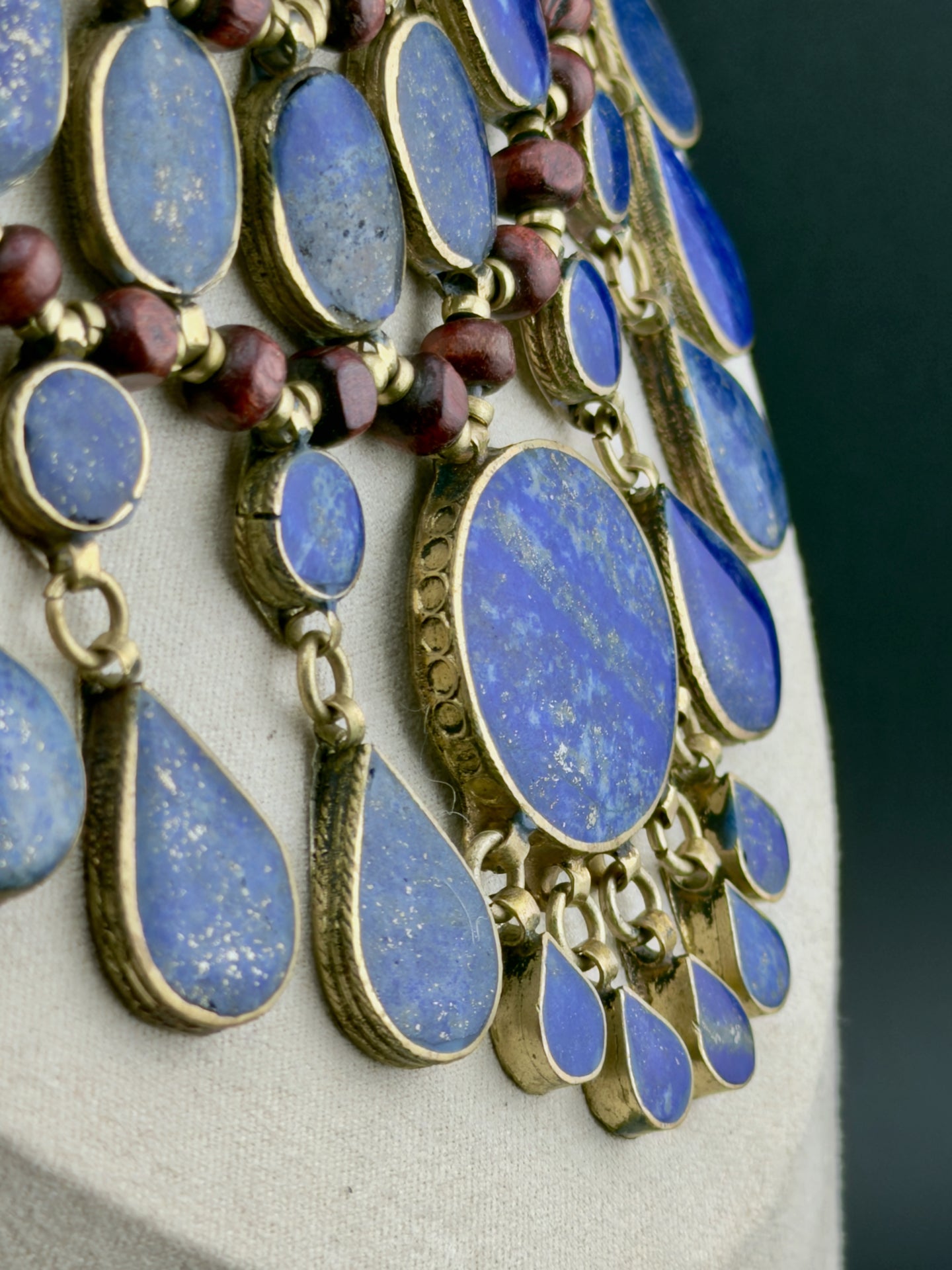 Discover the exquisite beauty of the Estate Antique Sterling Silver Lapis Lazuli Festoon Necklace. Spanning 19 inches with a graceful 3.35-inch drop at its center, this remarkable piece weighs a substantial 104.4 grams. The vibrant lapis lazuli stones are absolutely captivating, complemented by a few wood beads that enhance their striking blue hue. This necklace features stunning Afghan lapis lazuli stone, adding a unique and timeless charm to your collection — a truly extraordinary treasure with a rich history.