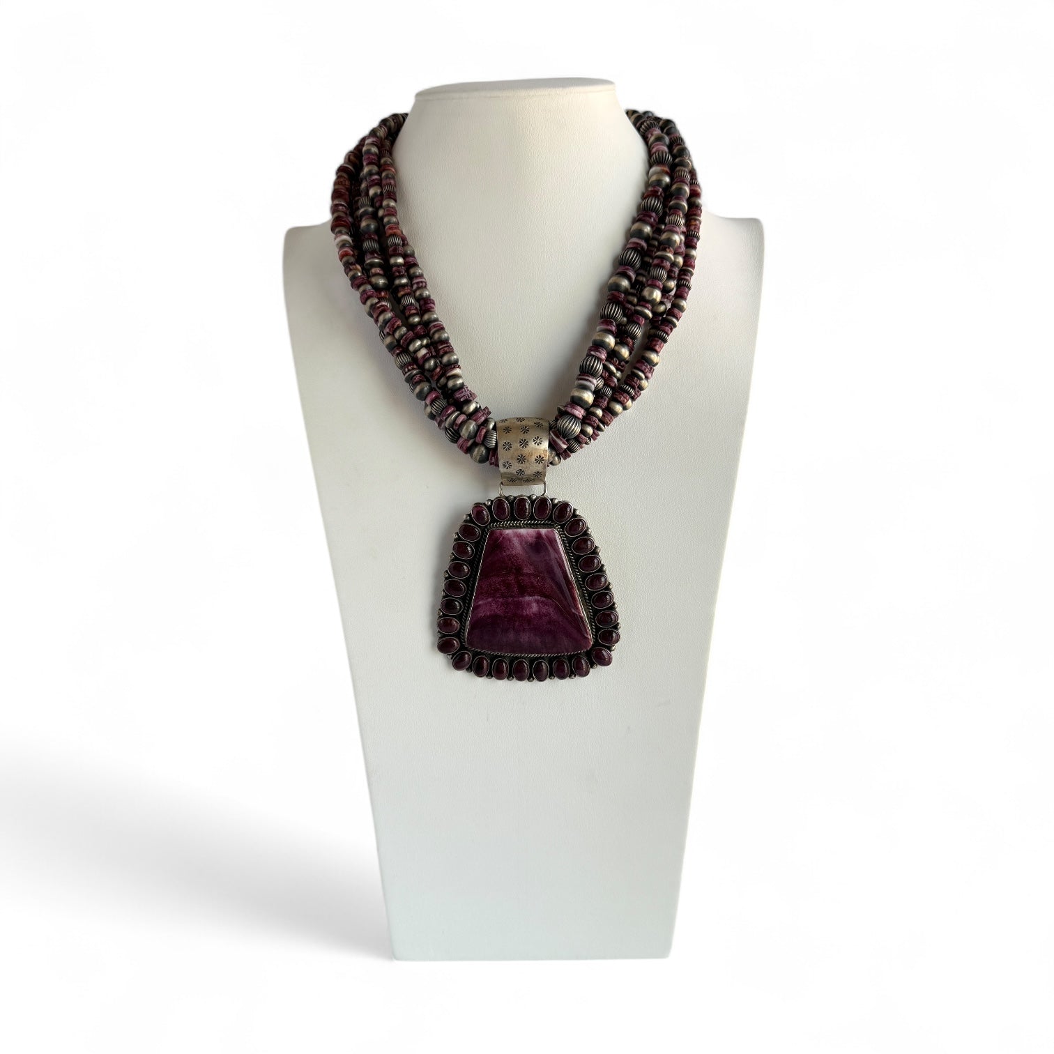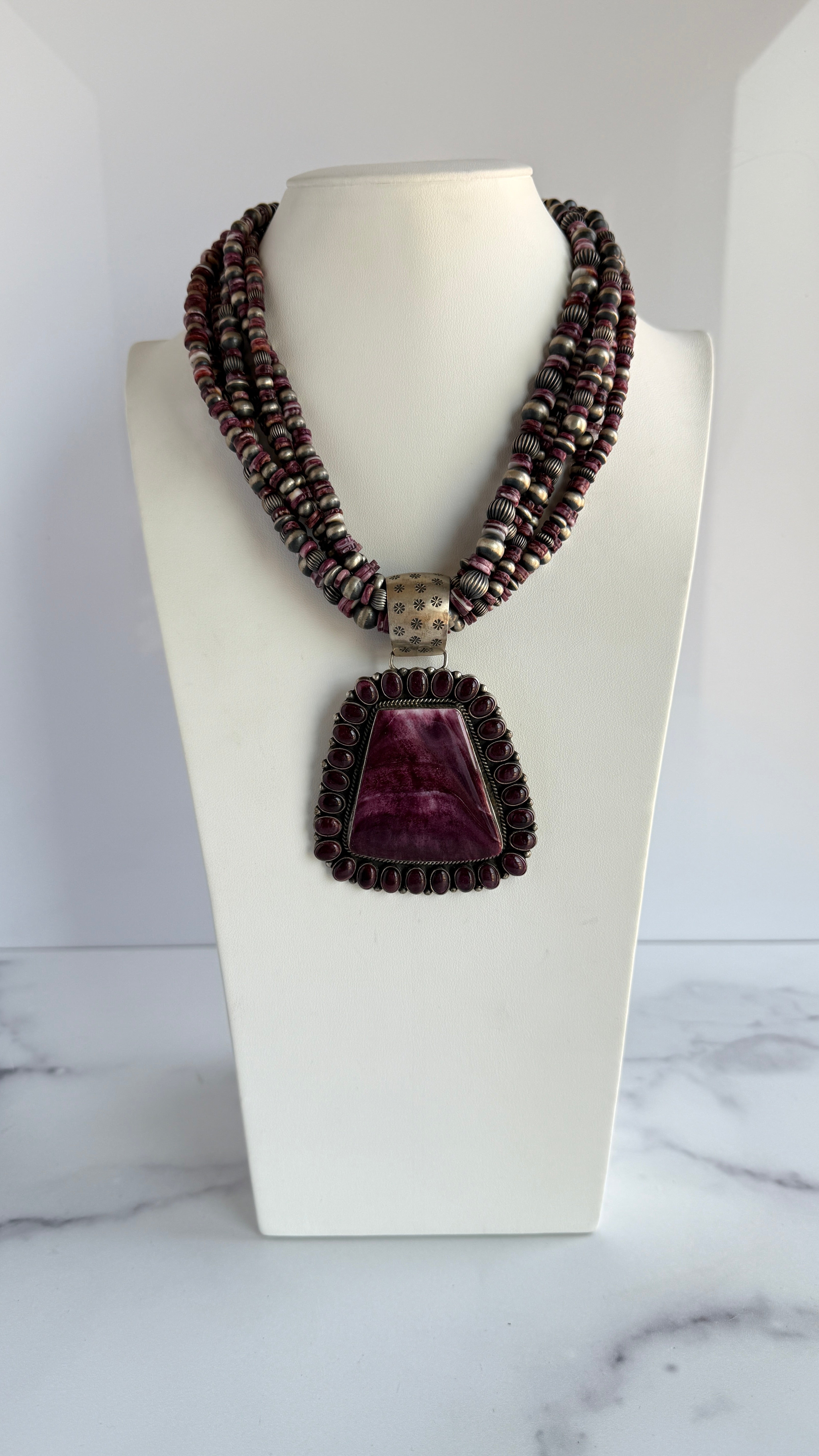 - Material: Purple spiny oyster centerpiece with sterling silver accents; beaded frame showcasing traditional Navajo beadwork.
