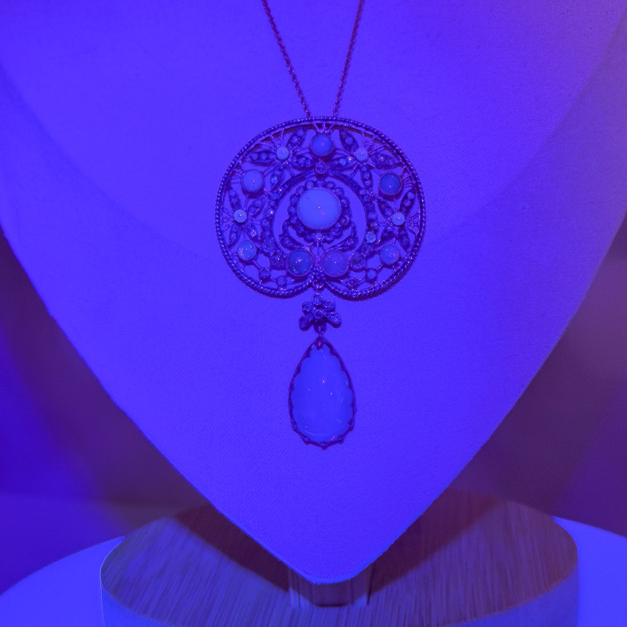 - Stones & Craft: 93 diamonds, 4 seed pearls, and a cascade of opals set in a detailed filigree circle.